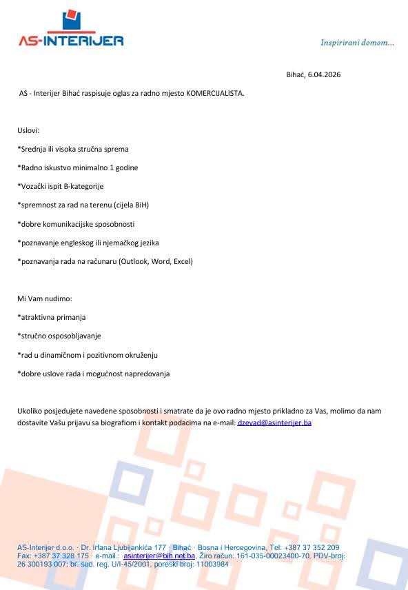 Prijavu sa biografijom i kontakt podacima na e-mail: dzevad@asinterijer.ba